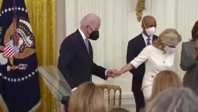 Of note, after recently making a speech about cancer funding, Joe-Joe had to be told to put on his mask. Then FLOTUS grabbed his hand to lead him off the stage.