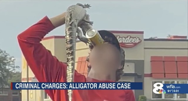 The video, recorded last Thursday in a Plant City Hardee’s parking lot, shows a group of teens handling a juvenile alligator roughly. One uses the gator’s teeth to puncture a can of Arizona Twisted Tea, then shotgun the alcoholic beverage with the young reptile still clamped to the aluminum can.