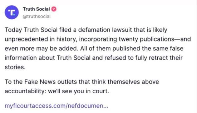 Today Truth Social filed a defamation lawsuit that is likely unprecedented in history, incorporating twenty publications—and even more may be added. All of them published the same false information about Truth Social and refused to fully retract their stories. To the Fake News outlets that think themselves above accountability: we’ll see you in court.