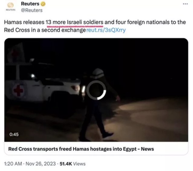 Reuters knew the hostages being released by Hamas were not soldiers (neither were the terrorists Hamas was receiving), but they casually dropped the term into their headline to fundamentally alter our perception of what is happening.
