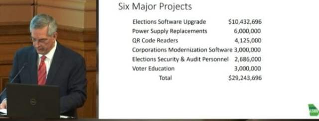 Raffensperger went on to request $32.3 million for FY25, with nearly two-thirds of the request “designed to address election security issues” for a total of $20.2 million. He also requested $6 million to replace the “aging voting machine power supplies” on the less than five-year-old systems (which was also requested last year) as well as $4,125,000 for QR Code Readers. Georgia’s BMDs currently print the voter’s intent in a non-human-verifiable QR Code on the physical paper ballot.