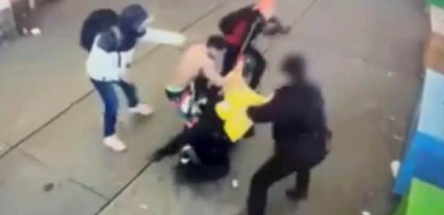 That’s when the rest of the punks converge on the officers, raining kicks to the head and body of the pair of New York’s Finest as the cops rumble with their pal, whose yellow sweatshirt is completely torn off in the melee.