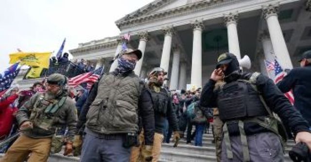 Members of the Oath Keepers stand on the East Front of the U.S. Capitol on Jan. 6, 2021, in Washington.